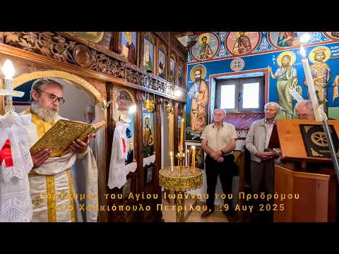 Με λαμπρότητα και κατάνυξη εορτάστηκε την Παρασκευή 29 Αυγούστου 2025 η Αποτομή της Τιμίας Κεφαλής του Αγίου Ιωάννου του Προδρόμου, στην Εκκλησία του Αγίου Ιωάννη στο Χαλκιόπουλο Πετρίλου όπου τελέστηκε πανηγυρική Θεία Λειτουργία μετά αρτοκλασίας από τον Πανοσιολογιώτατο Αρχιμανδρίτη π. Ιερόθεο Αργύρη και από τον εφημέριο του χωριού Αιδεσιμώτατο Πρεσβύτερο π. Δημήτριο Δεληγιάννη.